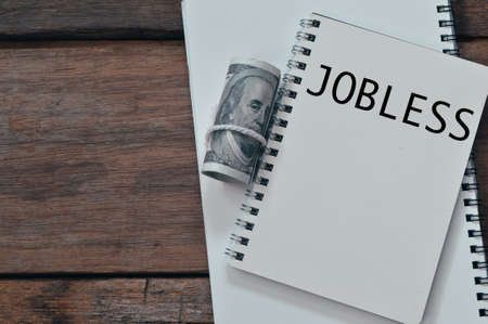 Top view of money banknote and notebooks written with JOBLESS.