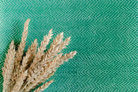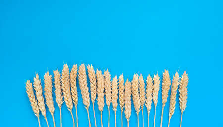 Spikelets of wheat on a blue background. Simple flat lay with copy space. Stock photo.