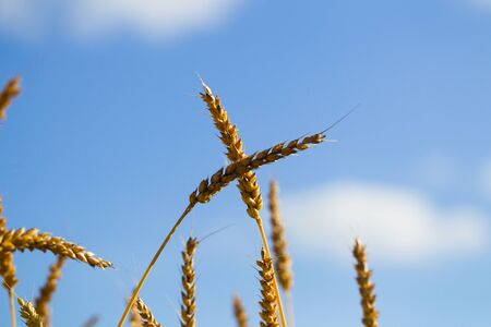 spikelets of wheat on a field on a farm against the backdrop of a clear blue sky