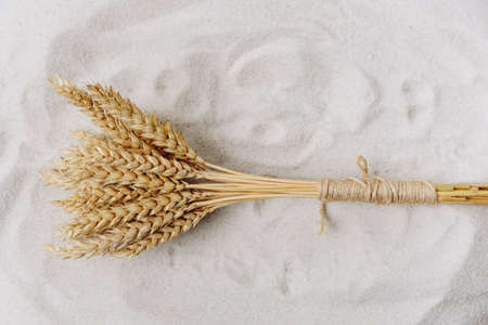Wheat on a white background close-up mock up. Wheat harvesting season, harvest festival. Copy space