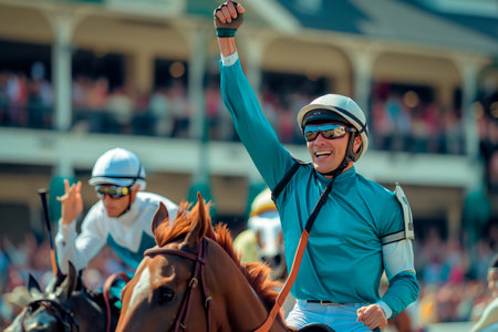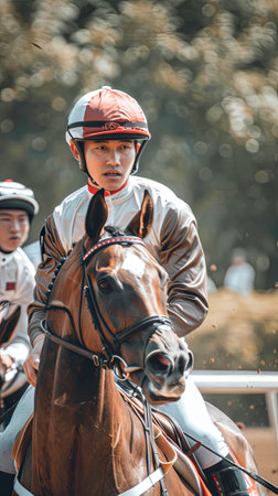 A close-up of a jockey in race gear, riding his horse with determination, showing focus and strength, ideal for horse racing advertisements