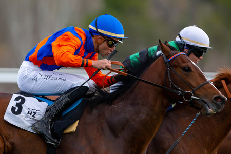 Madrid, Spain- March 6, 2022: Horse racing at the Hipodromo de la Zarzuela in Madrid. Jockeys on their horses during horse races.