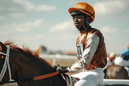 African American male jockey in racing attire with helmet at a horse race. Concept of horse racing, equestrian sport, athlete, competitive riding.