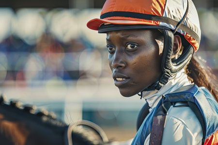 African American female jockey wearing a helmet on a racehorse. Concept of equestrian sport, competitive horse riding, women in sports, determination. Copy space.