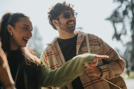 multiethnic couple with mobile phone on the street pointing