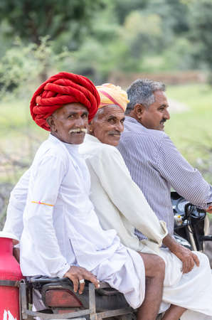 Jawai, Rajasthan, India - September 2021: Portrait of a male shepherd of the Rabari ethnic group in a national headdress and traditional white dress and red turban on the field of Jawai.