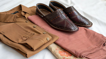 Discover the beauty of handcrafted leather shoes resting on a vintage textile. This image showcases intricate designs and rich textures, perfect for fashion enthusiasts or decor themes.