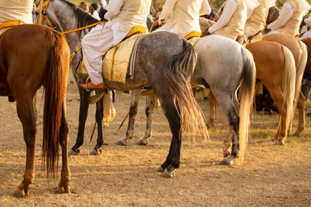 BIKANER, INDIA - JANUARY 12, 2019: Camel band performing at festival. The Camel Festival begins with a colourful procession of bedecked camels against the rugged backdrop of the Junagarh fort.
