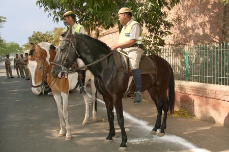 AGRA, INDIA - MARCH 31. Mounted Police on horseback patrolling the streets in Agra near the walls of the Taj Mahal on march 31, 2012 in Agra, Uttar Pradesh, India.