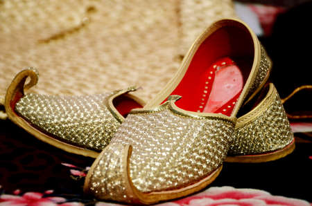 Colorful ethnic shoes and gipsy belt on yellow Rajasthan cushion cover on flea market in India