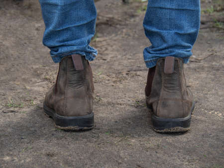 Legs of a man standing on wet ground in blue jeans and leather brown shoes