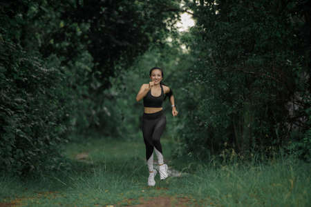 Asian Young female athlete jogging in forest. Jogger doing morning physical training.