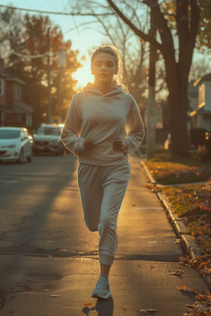 A woman in sweatshirts runs in the morning workout.