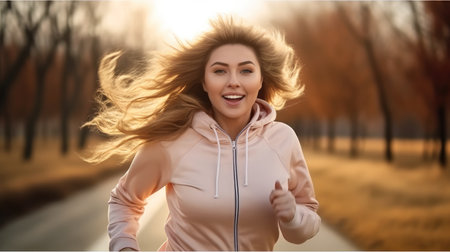 Plus-size woman jogging on road.