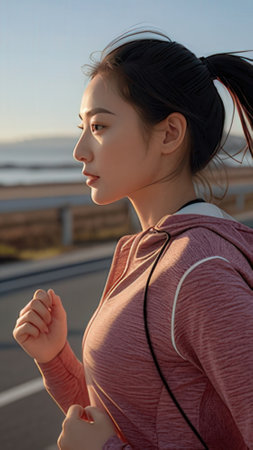 young beautiful asian woman jogging at sunrise on the city street