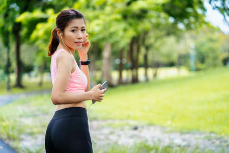 Portrait of an Asian woman exercising outdoors in a park, she is jogging for good health.