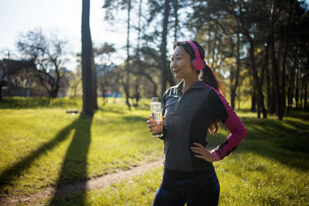 young happy Asian woman resting during running workout in wood on sunset . Attractive and healthy Korean girl panting after jogging in beautiful countryside road with trees background