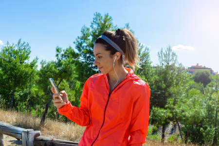 Beautiful woman runner with headset watching her messages on her smartphone at sunset.