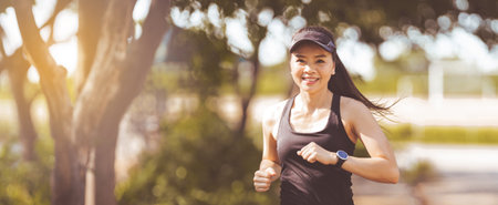 Happy smiling adult Asian woman jogging outdoor in the city park in sunshine beautiful summer day. Happy relaxed mature woman jogging to live an active and healthy lifestyle