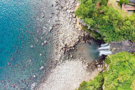 Looking Down Aerial View of The High Waterfall Jeongbang and Lagoon on Jeju Island, South Korea.