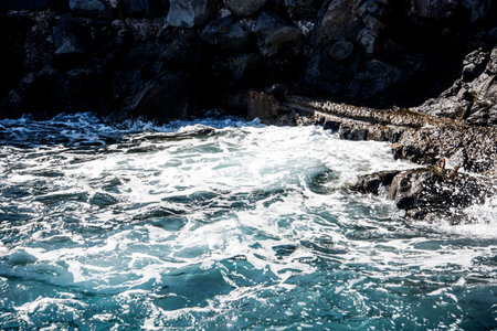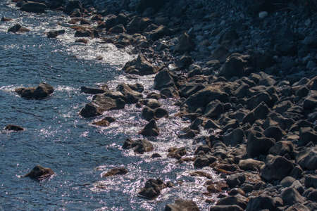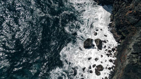 Landscape of a volcanic coast with black rocks, Atlantic ocean. Selective focus. Los Gigantes, Tenerife.