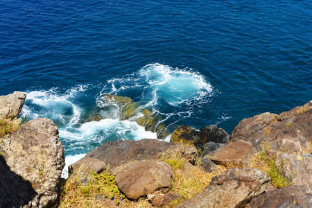 Atlantic surf on breakwater at Camara de Lobos a fishing village near to Funchal on the island of Madeira