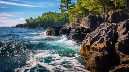 a stunning seascape photo captures the karst formations on the rocky shore of hestiasula head in the philippines. the archipelago's natural beauty is highlighted by the presence of pine trees near the science house in northern finland. the image showcases the rough sea with big waves crashing on the rocks, creating an amazing and dynamic scene. shot with a canon eos r5 f1.2 lens at