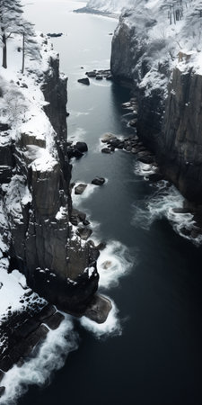 a high-angle photograph of a mysterious seascape featuring a rocky, snow-covered area surrounded by water. the image showcases contrasting values and realistic hyper-detail, capturing the beauty of the passage. this captivating photo was taken with a nikon s2 camera and is available under the creative commons attribution license. ai generated