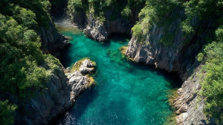 Waves lap against a stony beach in an unspoilt cove where forest meets the sea