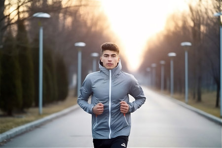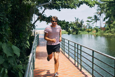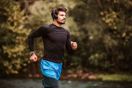 Young male athlete having a morning jogging next to the river.