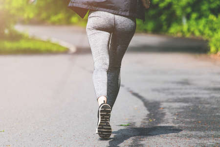 Feet of a runner. Young girl runs in the forest. Close-up of sneakers.