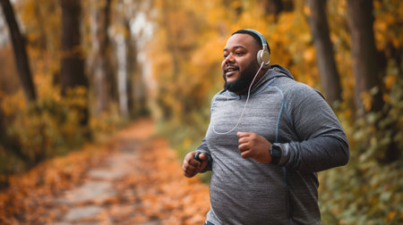Focused mature man enjoys a run in the park with headphones during the fall season