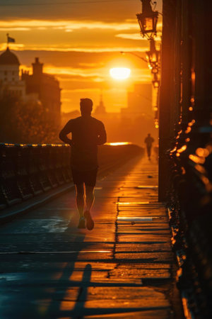 Runner at sunrise on a city bridge, silhouette against the early light, dynamic angle, embodying freedom and endurance