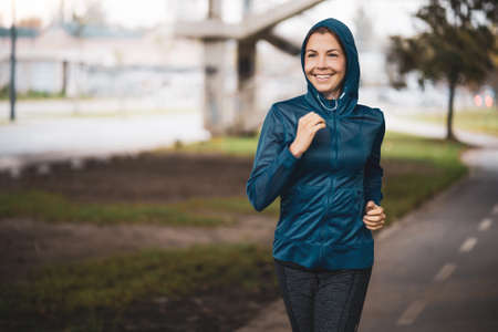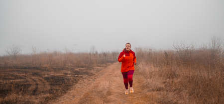 Beautiful adult woman is jogging outdoor on cloudy day in autumn.
