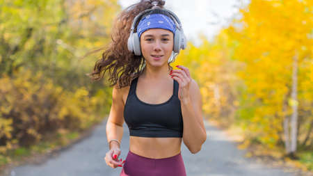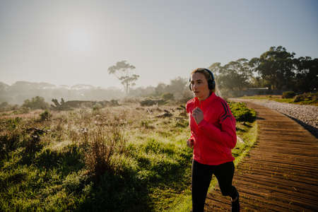 Caucasian athlete female listening to music with headphones while running on outdoor path in forest.