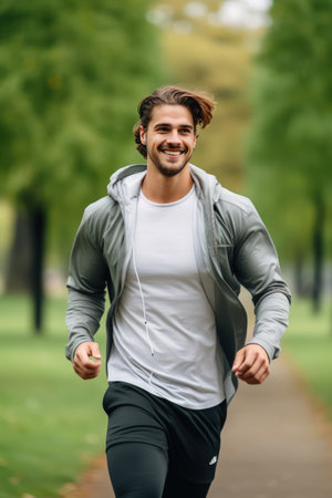 Sportive handsome man runs in a autumn park