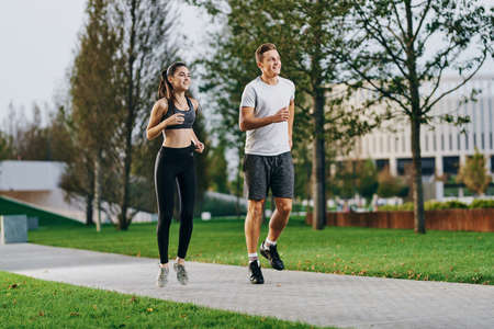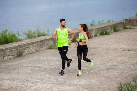 Sports guy and girl in stylish sportswear running along embankment, photo for blog or ad of sport healthy lifestyle