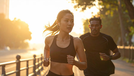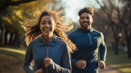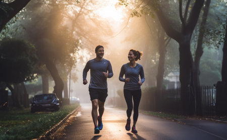 In the early morning glow, a vital couple energizes the streets with their invigorating run, embracing a healthy and active start to the day