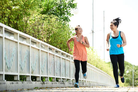 Active beautiful women in sportswear running together in the park. Sporty women friends exercising and jogging outdoors