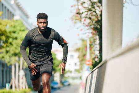 Serious concentrated Black young man running in the street when training for marathon