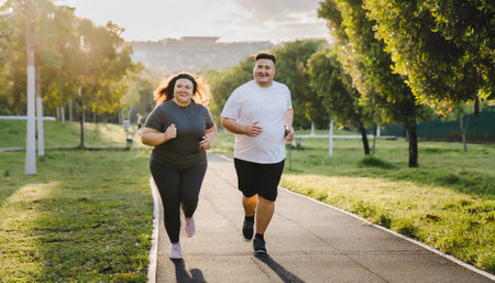 Fat woman and man running in the park at sunset. Healthy lifestyle.
