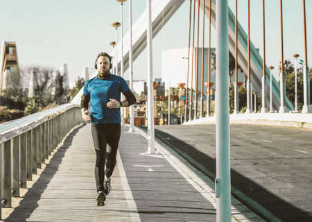 young man running on a bridge in a blue shirt and listening to music with a pair of headphones.