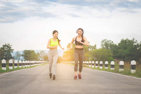 Runners - two women running outdoors training. Exercising female athletes jogging outside on nature smiling happy. Multiracial Asian and Caucasian woman in healthy lifestyle.