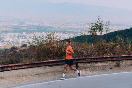 Young man running in the green fields in the morning. Fitness and lifestyle concept.