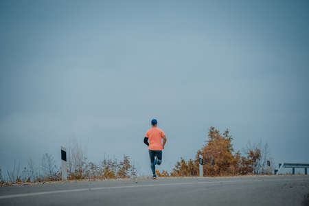 Sportsman runs along the road in the forest. He listening to the music via earphones.