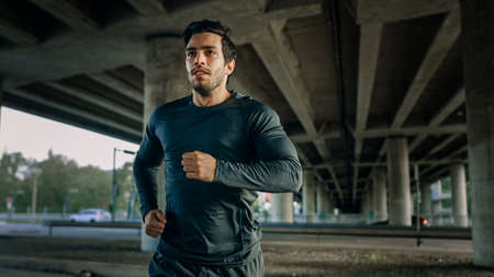Athletic Young Man in Sports Outfit is Jogging in the Street. He is Running in an Urban Environment Under a bridge with Cars in the Background.