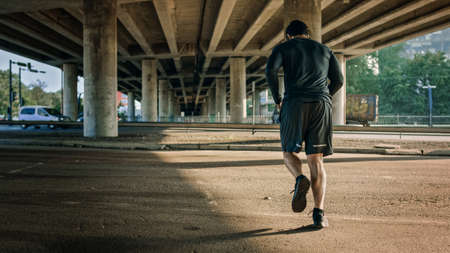 Backshot of an Athletic Young Man in Sports Outfit Jogging in the Street. He is Running in an Urban Environment Under a bridge with Cars in the Background.