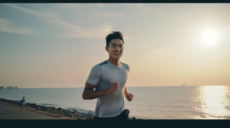 Generative AI : man athlete running by the sea at sunset outdoors