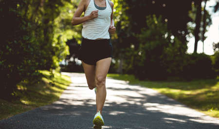 Female runners running on the road trail in morning training for marathon and fitness. Healthy lifestyle concept. Athlete running exercising outdoors. Close-up legs.