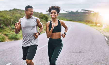 Athletic couple running on a street next to each other. Nature,fit and healthy concept.